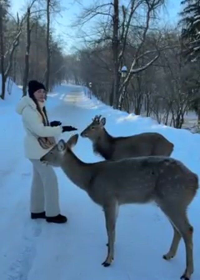 In a brightly lit outdoor setting, a young woman feeds two deer on a snow-covered path. The woman, dressed in a light-colored jacket, pants, and a black beanie, stands on the left side of the path, holding food in her hand for the deer. Two deer stand in front of her, with one deer slightly ahead of the other. The deer appear gray or brown in color. The path stretches into the distance, lined with trees on both sides. The trees are bare of leaves, indicative of a winter setting. Snow covers the ground and the surrounding areas. The sky is bright blue.