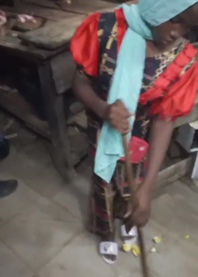 A young girl is sweeping the floor in what appears to be an indoor market or food preparation area. She is wearing a long, patterned dress with red puffy sleeves, white sandals, and a light blue headscarf. A small pink purse is visible hanging at her waist. She is using a red and purple broom with a wooden handle to sweep up pieces of white and yellow food waste from the tiled floor. Behind her, several men are present. They stand around a wooden table that has some food on it. The environment seems cluttered and perhaps a bit run-down. The lighting is somewhat dim. The sound of an engine or machine can be heard in the background.
