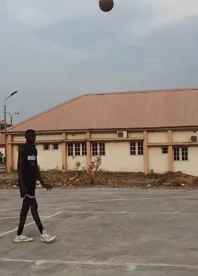 Three young men are playing basketball on an outdoor court with gray pavement and white lines. Two buildings with light tan walls and red roofs stand behind the court, and a few other people are in the background. The sky is overcast. One man is wearing a white tank top and black shorts with red trim, and he shoots the basketball toward the hoop. Another man, wearing a black tank top and black shorts with green trim, stands near the net. The ball goes in. A third man, wearing a gray top and black shorts, stands in the background.