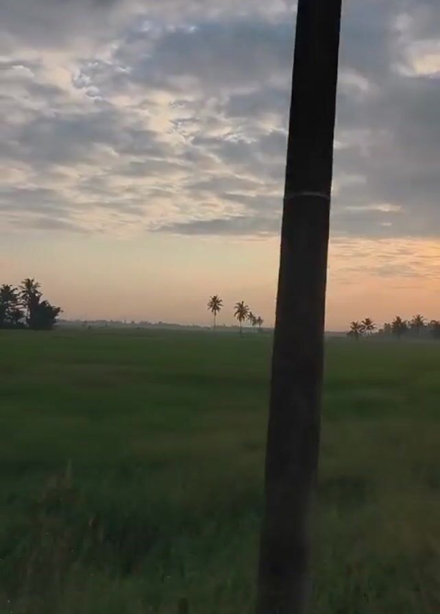 The video captures a scenic view of a green rice field at sunrise. The foreground is dominated by the field itself, with tall blades of grass swaying gently. In the distance, a line of palm trees punctuates the horizon, their silhouettes distinct against the backdrop of the rising sun. The sky is filled with clouds, their hues ranging from gray to white. A few patches of orange light break through the clouds, indicating the sun's position just below the horizon. The overall atmosphere is calm and serene. The camera appears to be moving, possibly from a vehicle, which may explain the sounds from the engine.
