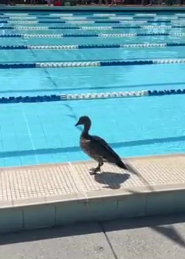 single duck standing on the edge of a swimming pool, with a crowd of people in the background. The duck is a mottled brown and grey color, with a long neck and a small head. It is standing on a white-tiled ledge along the edge of a pool, with blue water and lane markers visible in the pool. The background is a crowd of people. Some are standing, some are sitting, some are wearing masks, and some are not. There are a few trees visible in the background as well. The sun is shining, and the scene appears to be set outdoors at a swimming competition or public pool. The camera moves slightly, as if being held by a person.