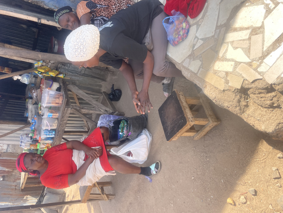 This image depicts an outdoor market or roadside stall scene in Jos, Nigeria, featuring three adult females engaged in conversation under bright daylight