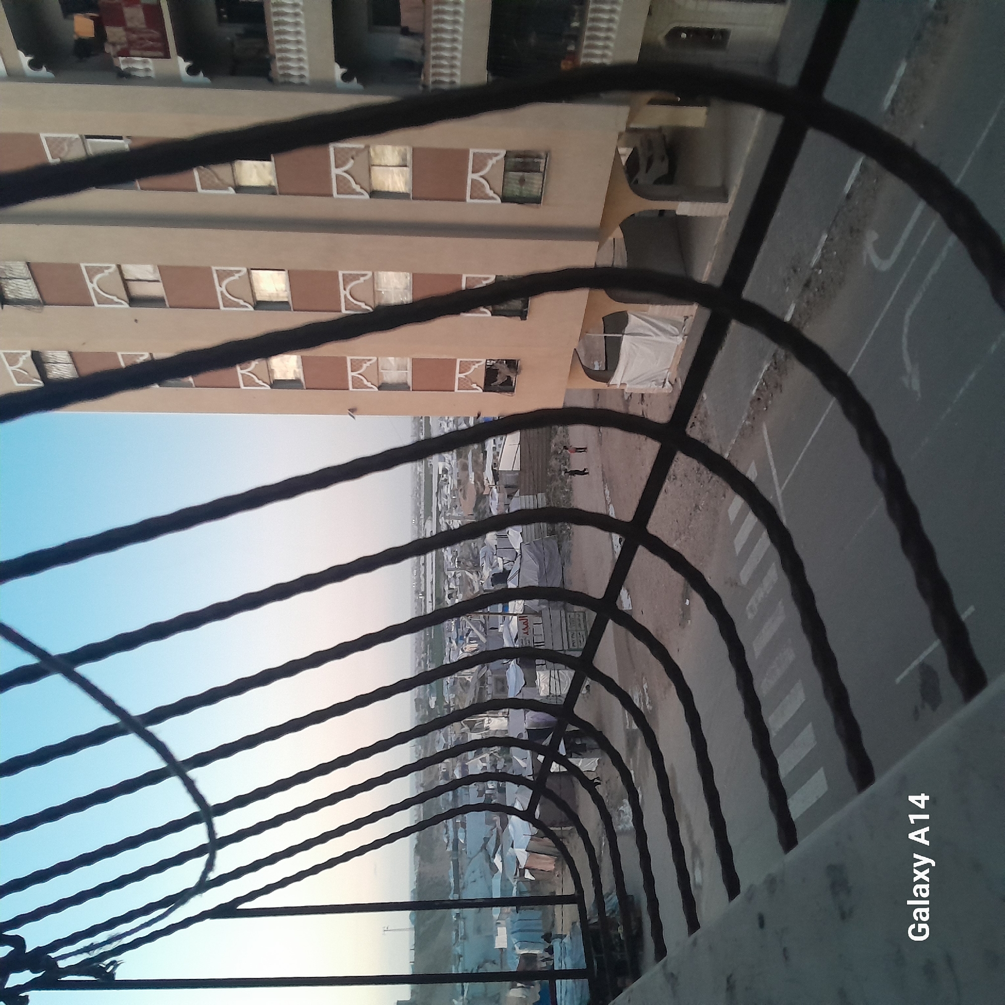 The image, taken from an elevated position, shows a view through a metal railing