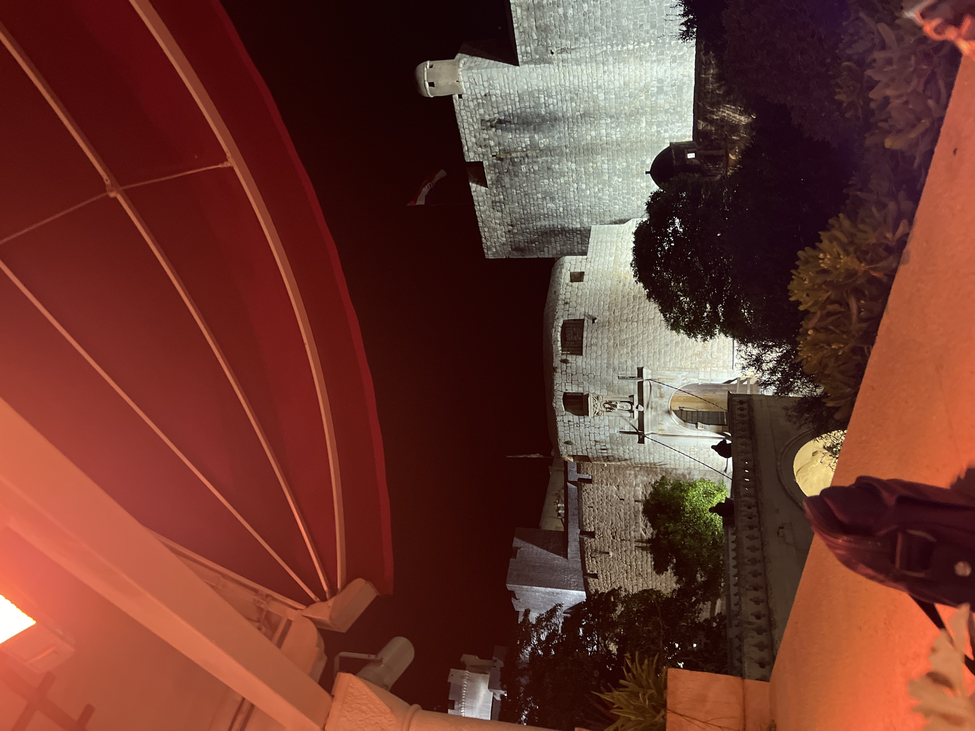 section of the Walls of Dubrovnik in Croatia at night. The stone walls and towers are visible, with lighting emphasizing the texture of the stonework. A red awning is prominent in the foreground, suggesting a nearby restaurant or establishment. The perspective is from below, looking up at the walls, with some foliage partially obscuring the view.