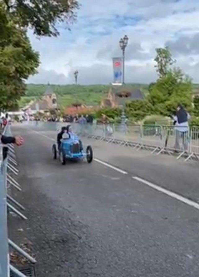 A light blue vintage-style car with exposed wheels drives on a paved road lined with metal barricades on both sides. People stand behind the barricades, watching the car pass. Some are taking photos or waving. The car has two occupants, both wearing dark clothing. In the background, there are buildings with red tile roofs, green trees, and a cloudy sky. A banner with the Bugatti logo is visible in the distance. A storm drain is visible in the lower left.