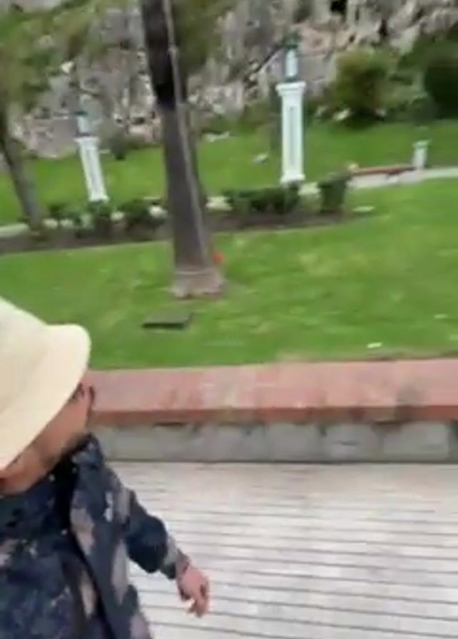 person wearing a cream-colored bucket hat, sunglasses, and a patterned jacket walking on a paved pathway. Behind the person is a green grassy park area with palm trees, statues, and a brick border along the pathway. On a hill in the background, there is a stone building or castle. The sky is overcast. The camera appears to be handheld and is recording from the perspective of someone walking alongside the person.