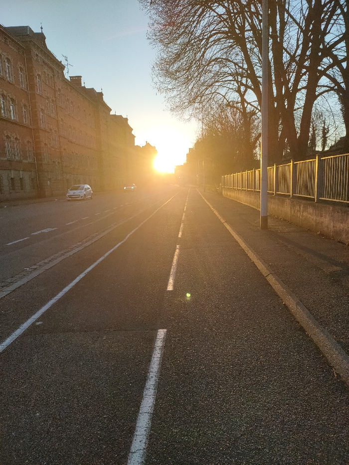 - "This image depicts an urban street in Strasbourg, France, viewed directly towards a low sun on the horizon, indicating either sunrise or sunset" by FM-tMAHv2, licensed under CC BY 4.0