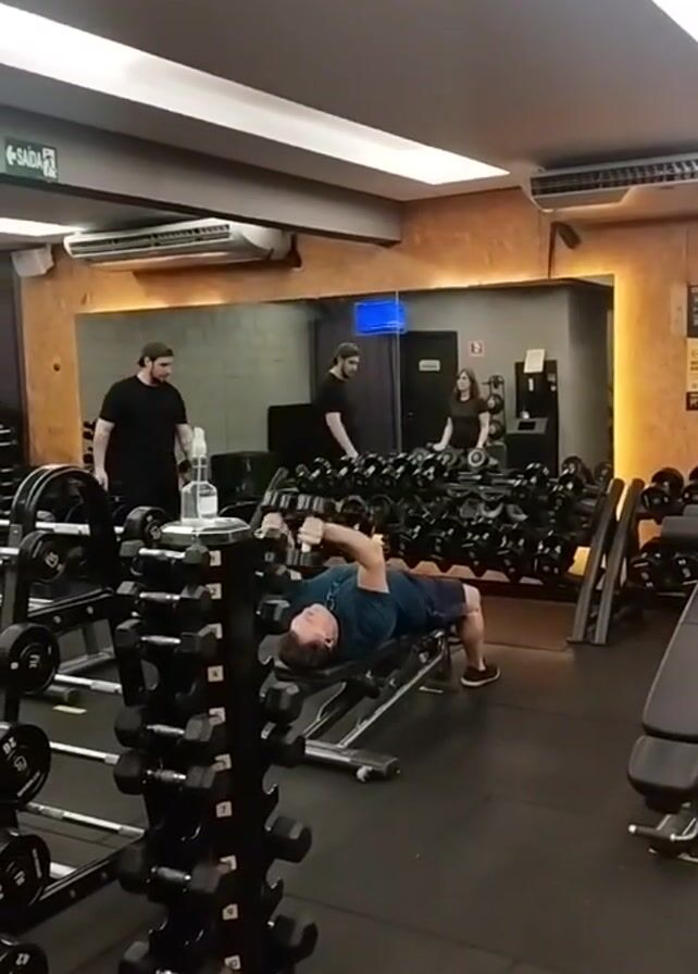 gym with several people working out. The camera focuses on various gym members, including a man performing dumbbell bench presses, a man on an exercise bike, and other individuals using their phones or standing near weight racks. The gym is well-equipped with dumbbells, benches, and exercise machines. There is also a large mirror reflecting the gym's interior.
