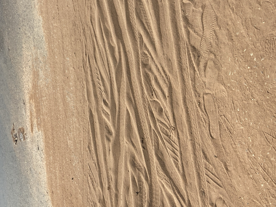 The scene depicts a ground-level view in Orifite, Nigeria, showing a transition zone between a paved road and a sandy area. The upper segment features a grey asphalt or concrete surface with a cluster of light-colored debris and a dark, wet-appearing stain. This paved section transitions into a reddish-brown, fine-grained sandy or dirt surface that dominates the lower two-thirds of the image. The sandy area exhibits numerous undulations and is extensively marked by overlapping tire tracks with various tread patterns, indicating vehicular passage. Multiple human footprints are also visible throughout the sand, some showing clear shoe sole imprints, signifying pedestrian activity.