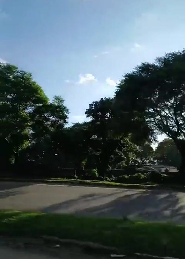view from a moving vehicle on a paved road. The road has a green grassy shoulder. A large leafy tree is visible to the side of the road. In the distance, a tall communications tower is visible. The sky is blue with scattered white clouds. Two white vehicles pass on the intersecting road. The vehicle continues to move forward, passing a tall advertising billboard.