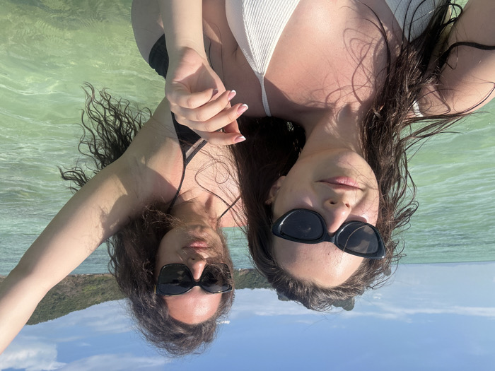The image depicts two young adult females standing in clear, shallow, light turquoise-green ocean water