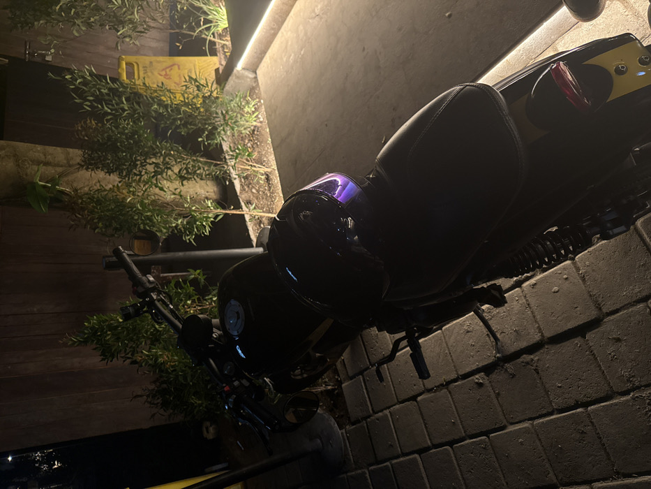- "An overhead, low-light shot depicts a black motorcycle parked on a paved surface made of rectangular grey pavers at night in Ubud, Indonesia" by FM-gfWXg2, licensed under CC BY 4.0