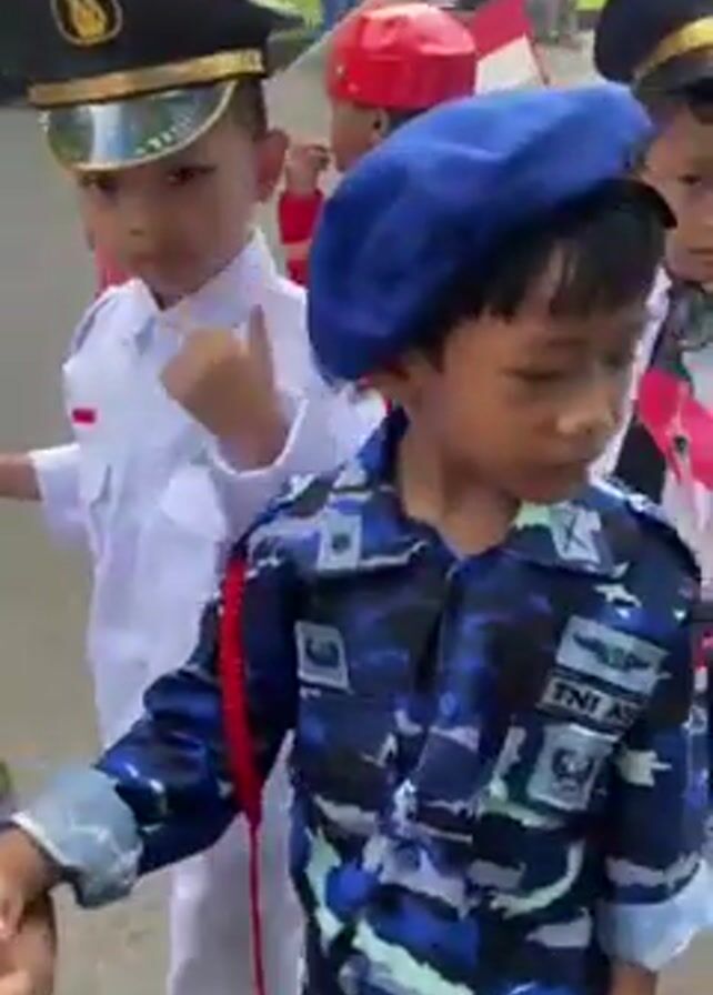 A group of small children are walking down a street holding hands and waving Indonesian flags. The children are dressed in costumes depicting different professions, including pilots, firefighters, sailors, doctors, and flight attendants. The group walks along a paved road lined with trees and parked cars, as people in the background watch.