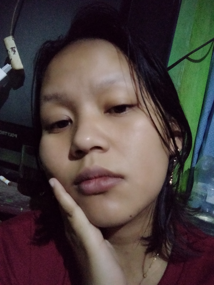 A person with light brown skin and dark hair gazes directly at the camera, their left hand gently touching their cheek. They wear a dark red shirt. The background features a dark area with a partial view of an old television, as well as green and blue colored walls. The lighting is dim, and a cork-like object hangs in the upper left corner. The person wears dangling earrings and a thin necklace.
