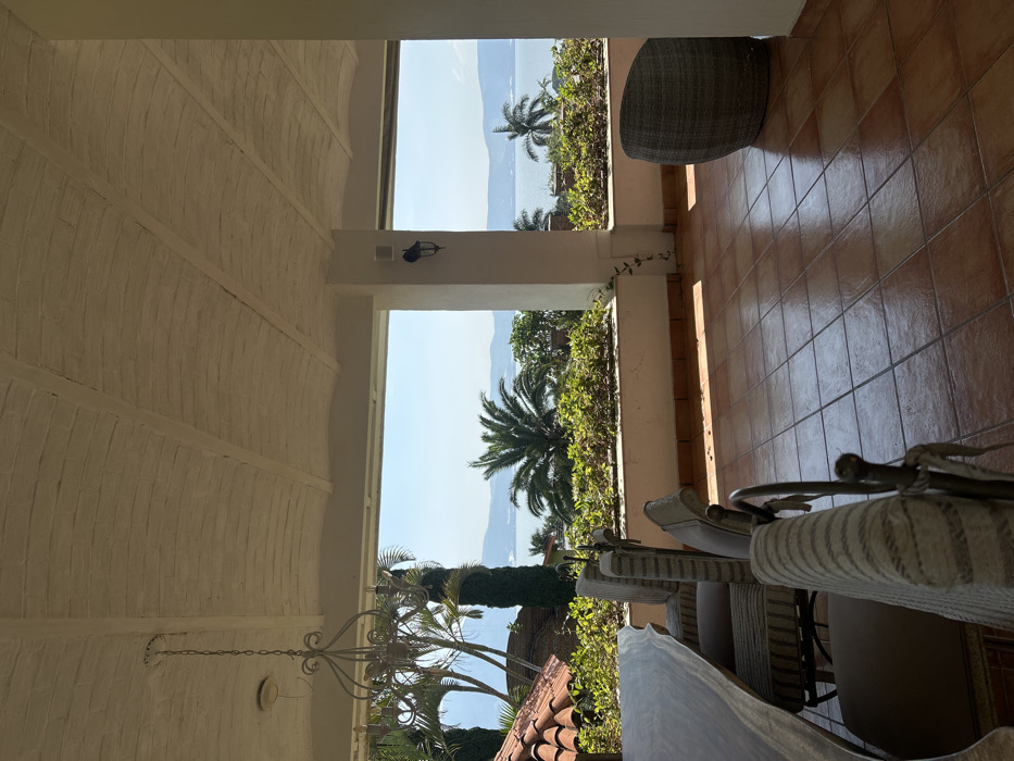 The image depicts a covered outdoor patio or terrace in San Juan Cosalá, Mexico, offering a panoramic view of a large body of water and distant hills under a clear blue sky