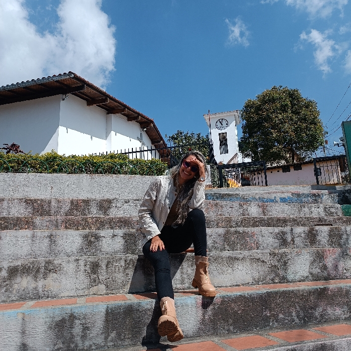 An outdoor, eye-level photograph shows a woman seated on a set of weathered concrete steps under a clear blue sky with scattered white clouds. The woman, positioned centrally, has long, wavy light-colored hair and wears red-framed sunglasses. She is dressed in a light-colored jacket, dark leggings, and tan combat-style boots, smiling while her right hand rests on her forehead, partially obscuring her upper face. Her legs are extended forward on the steps, which exhibit discoloration and some vegetative growth. A reddish-brown tiled pavement is visible at the base of the steps. In the background, to the left, is a white building with a dark tiled roof, fronted by a black metal fence and green shrubbery. To the right, a white clock tower with a black clock face displaying hands at approximately 12:45 stands, partially obscured by a large green tree. Dark electrical wires are visible across the upper right portion of the sky. The scene is located within the city of San Pedro de Los Altos, Venezuela.