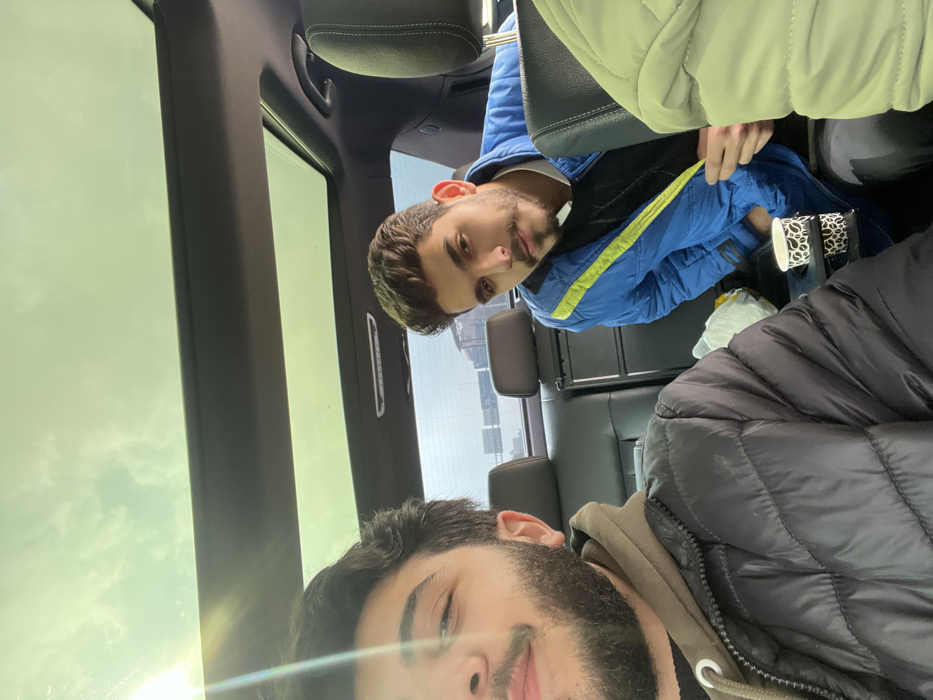 The image depicts two young males inside a vehicle, located within the city of Dummar Municipality, Syria. In the foreground, positioned on the left, a male with dark hair, a full beard, and a mustache is partially visible, primarily his left profile and torso. He wears a black quilted jacket over a dark hooded garment and looks directly at the camera with a slight smile. Direct sunlight flares prominently from the upper left quadrant. Seated in the rear passenger compartment on the right, a second male is visible from the chest up. He has short dark hair, a mustache, and light stubble. He is dressed in a bright blue quilted jacket featuring a vertical neon yellow stripe along the side, worn over a dark shirt that reveals a white collar. He maintains a direct gaze towards the camera. The vehicle's interior features dark seating and a panoramic sunroof, through which a bright, cloudy sky is visible. A rear window view reveals a multi-lane roadway or highway with overhead gantry structures in the distance, indicative of an urban setting. A foldable tray table deployed from the back of the front seat holds two white disposable cups adorned with a black and white patterned design. A white plastic bag rests on the seat next to the rear passenger. The scene is illuminated by natural daylight.