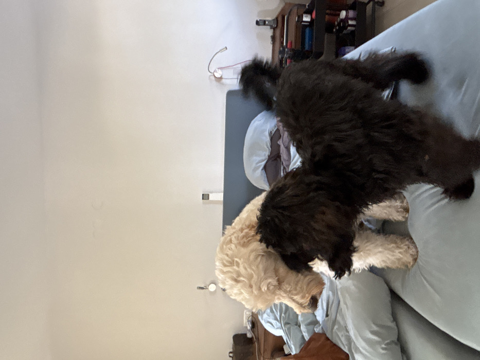 This image depicts a domestic bedroom in Ramat HaSharon, Israel. Two dogs are present on a large bed with light blue bedding. A light-colored, curly-furred dog, appearing cream or blonde, stands towards the left, facing downward. In front of it, a dark-colored, curly-furred dog, appearing black or dark brown, stands facing generally right, its tail blurred from motion. A blue headboard is visible behind the animals. To the left of the bed, a dark wooden nightstand holds a brown bag, above which a wall-mounted light fixture is attached. To the right, another wall-mounted light fixture is visible, along with a multi-tiered dark rolling cart containing a cordless phone and various bottles. The room features plain light-colored walls and is brightly illuminated.