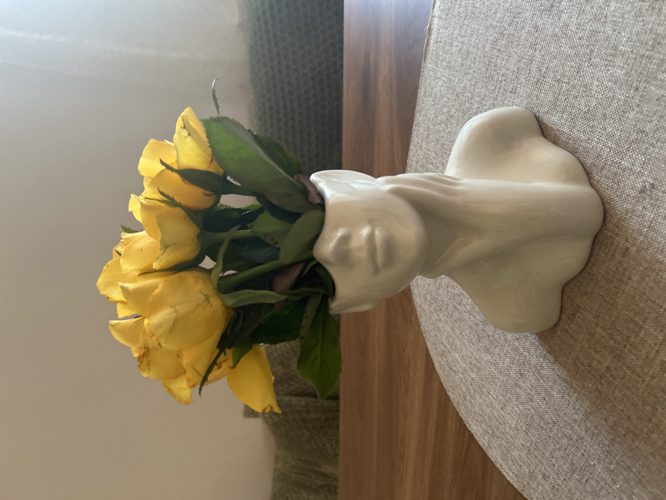 A static indoor scene in the city of Blagoevgrad, Bulgaria, features a white ceramic vase shaped like a female bust, positioned centrally on a wooden table