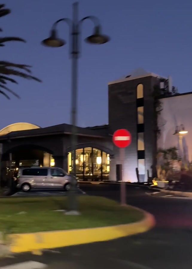 The camera moves past a white car in front of a building at twilight. The building has the words "RIO BACON" in neon lights on the roof. A stop sign is on a post near the car. The camera passes palm trees and shrubs as it drives by the building.
