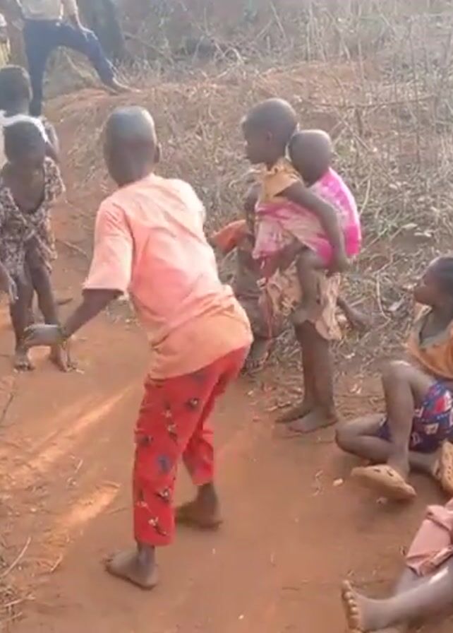 In an outdoor, sunlit setting, a group of approximately 15 barefoot children are seen playing. A man stands in the background, positioned on a small hill, observing the children. A path of red dirt cuts through the scene, with some of the children standing or dancing on it while others sit on the ground to the right. The children are dressed in a variety of casual clothes, with a mix of t-shirts, dresses, and pants, some showing signs of wear. The surrounding environment features dry, brown vegetation and a building in the far background. The children appear to be engaged in an active game, characterized by movement and interaction among them.