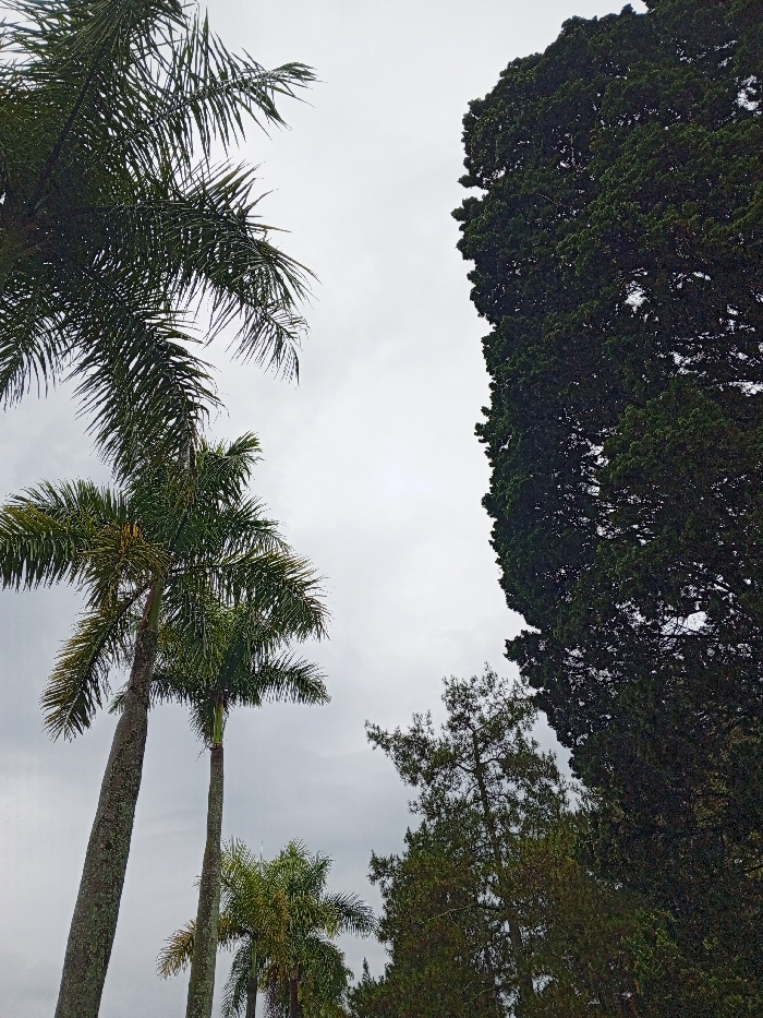 The image displays a low-angle view of a tree canopy against an overcast sky in Ganwin, Liberia. On the left, multiple tall palm trees are visible, characterized by their slender trunks and dark green, prominent fronds, extending from the lower frame upwards and out of the view. On the right, a dense, dark green evergreen tree, possibly a conifer, forms a solid vertical mass along the entire right edge of the frame. Below this larger evergreen, additional, shorter evergreen foliage is present. The sky occupies the upper and central portions of the image, appearing uniformly light grey, indicative of overcast conditions. No individuals, animals, or man-made structures are discernible within the frame. The scene presents a static, natural environment.