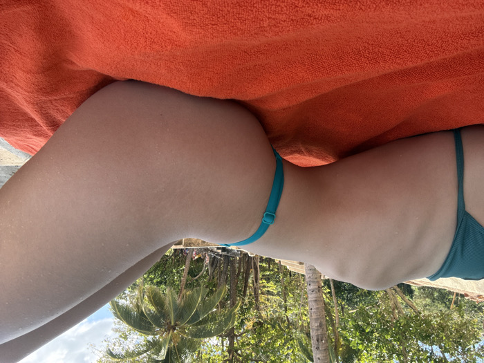A person in a blue bikini lies on an orange towel outdoors. The camera angle is above, capturing the side of the body from thigh to upper chest. The background shows palm trees and other tropical vegetation, suggesting a beach or resort setting. The sky is partly visible in the lower left. The person's skin appears lightly tanned.