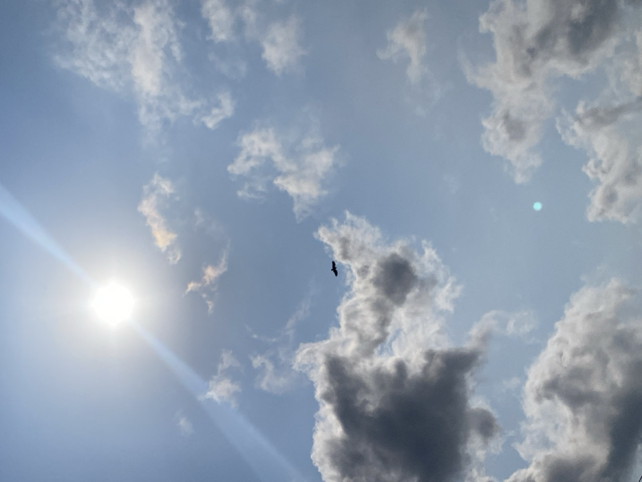 The image displays an expansive bright blue sky over Achara, Nigeria, observed during daytime. A brilliant white sun, positioned in the upper-left quadrant, emits a prominent lens flare radiating diagonally across the frame. Scattered cumulus clouds are present, varying from luminous white to darker grey masses, with a significant dark grey formation occupying the mid-left portion of the sky. A single bird, silhouetted in black with outstretched wings, is captured in flight in the upper-middle right area of the scene. No human subjects, man-made structures, or direct interactions are visible.