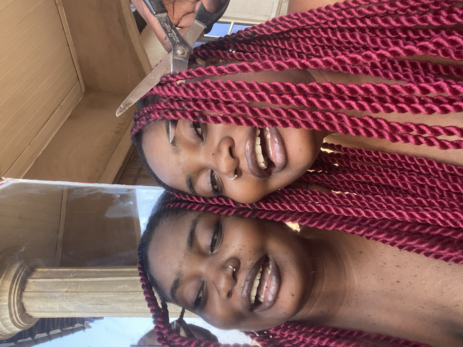 A person with burgundy braids is reflected in a mirror. The person is smiling and has a nose ring. In the reflection, the person's eyes are closed, but they are also smiling. A hand holding scissors appears to be cutting one of the braids. The background is blurry but appears to be an outdoor setting with a building and some trees visible.