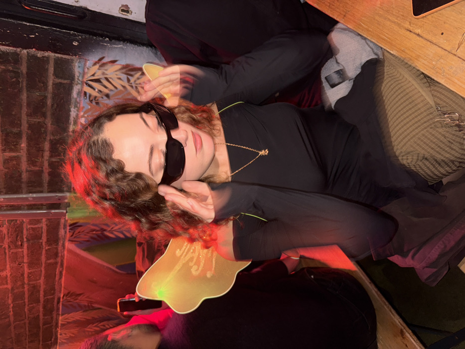 The image depicts an indoor scene within an entertainment establishment, characteristic of venues found in London, United Kingdom. The environment features exposed brick walls, a mural or painted pattern of large leaves, and is illuminated by prominent red ambient lighting. The central subject is a young woman, seated, with light skin and shoulder-length curly brown hair. She wears a black off-the-shoulder long-sleeved top or dress with neon green piping along the neckline. A gold-colored necklace with a small pendant is visible. She is wearing dark, elongated oval-shaped sunglasses and is in the process of adjusting them with both hands, positioned near her temples. On her back are light yellow, translucent wings with glitter accents. Her gaze is directed downwards and slightly to the right. To the left of the central subject, the back of another individual's head and shoulder are visible. This person has dark hair and is holding a smartphone vertically in their right hand. To the right of the central subject, a dark shoulder and arm of a third individual are partially visible, with a light grey item (possibly clothing or a bag) resting on a surface next to them. The individuals are seated at a wooden table or counter, part of which is visible in the foreground. A wooden bench is also visible to the left. The overall atmosphere is dim and intimate, consistent with a bar, club, or pub setting.