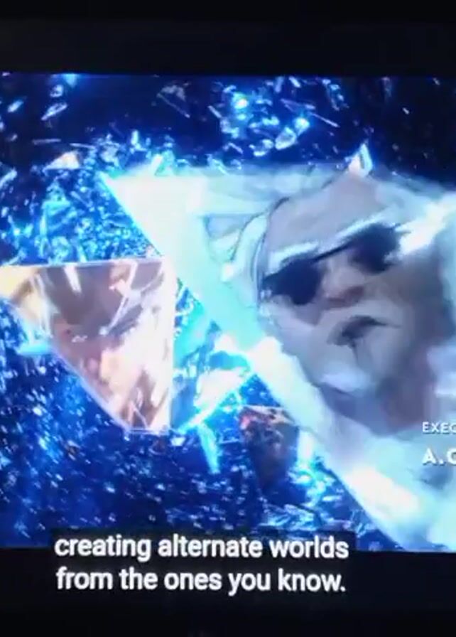 television screen displaying an animated sequence from a Disney+ show. The animation consists of broken shards or pieces of what appear to be images of characters, set against a backdrop of deep blues and blacks. The text "creating alternate worlds from the ones you know." is displayed at the bottom of the screen along with the Disney+ logo. Text identifying the executive producer appears on the right side of the screen, first A.C. Bradley then Bryan Andrews. The animated images are constantly shifting and changing in a rapid, abstract way, before the scene closes in on a central point of blue light.