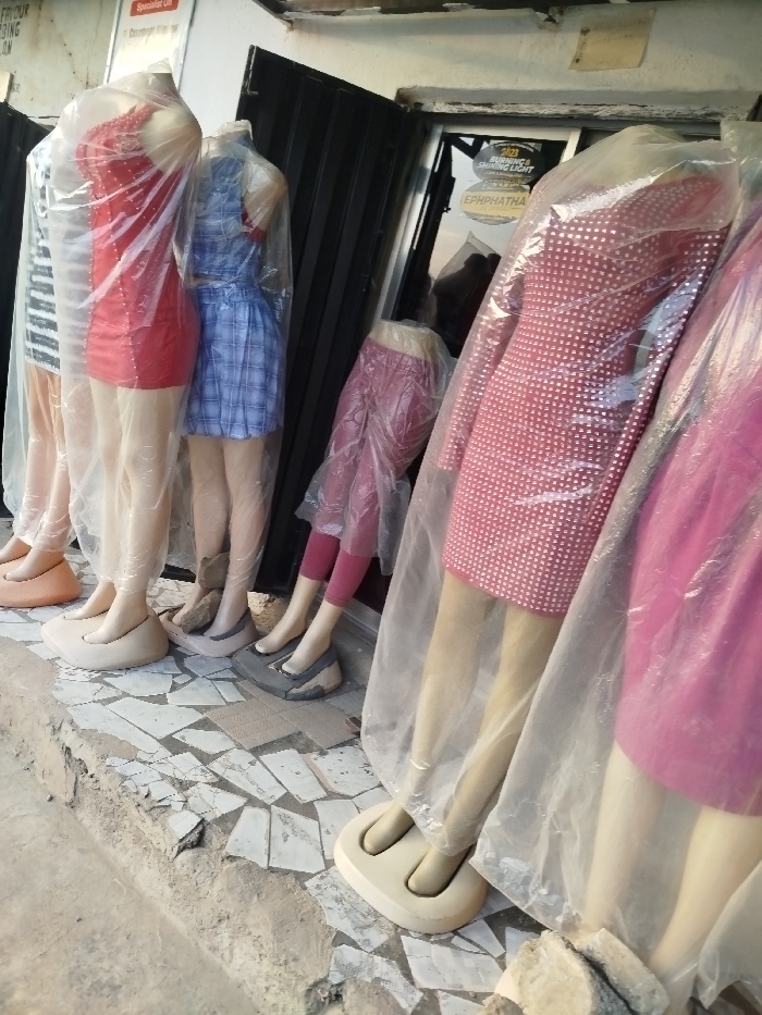 Several headless mannequins, partially covered in transparent plastic, stand outside a shop on a tiled walkway. The mannequins wear various dresses in shades of pink, red, blue, and striped black and white. One mannequin features a separate torso and legs with pink leggings. The shop entrance is visible in the background, with a sticker on the glass door. The mannequins are arranged closely together, showcasing the clothing.