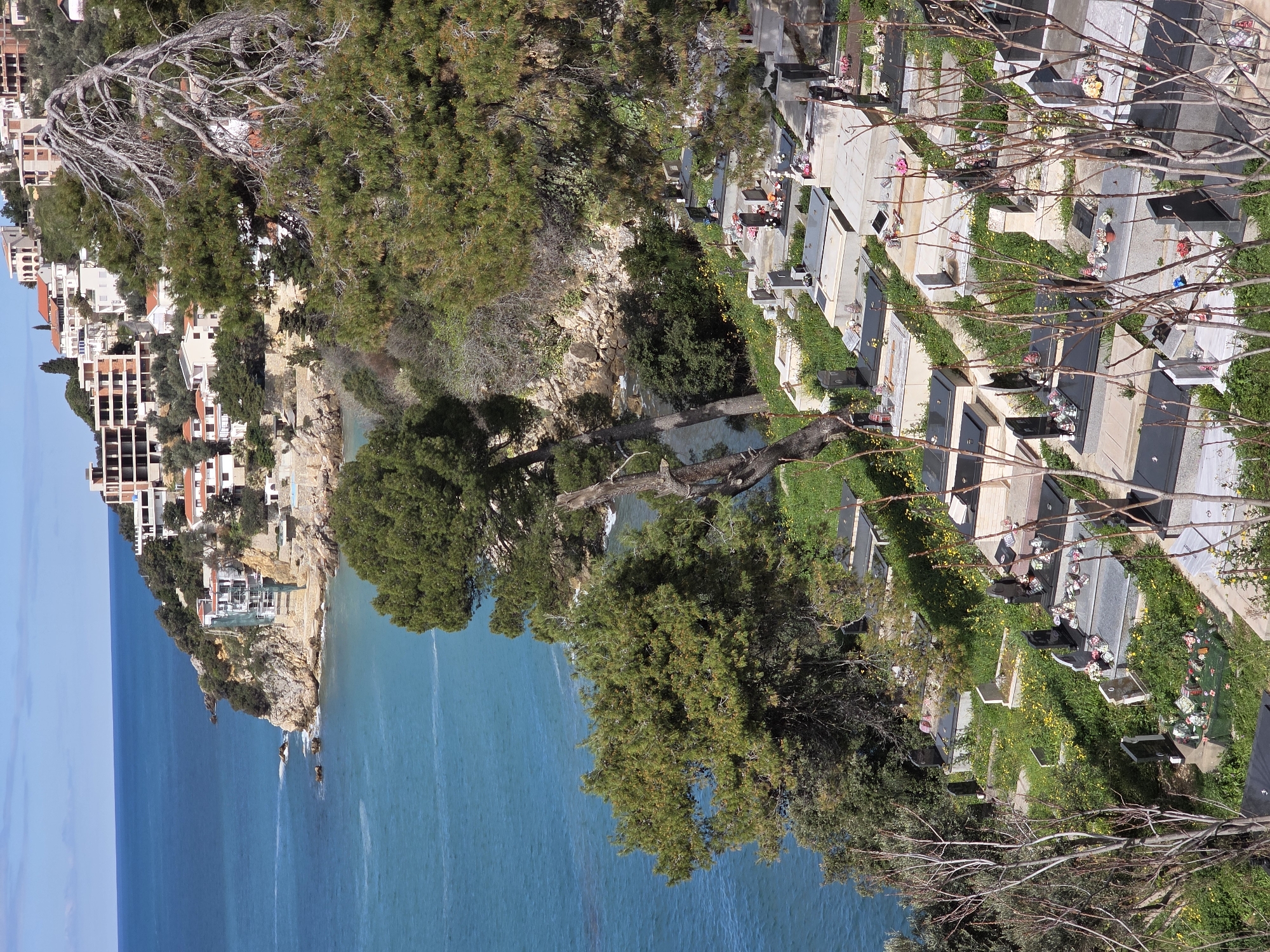 The image captures a view overlooking the coastline of Ulcinj, Montenegro. In the foreground, a cemetery with numerous grave markers and tombs, some adorned with flowers and plants, is visible. The land slopes downward, leading to a rocky cliff where buildings are perched. The Adriatic Sea stretches out, with varying shades of blue, meeting the horizon. Trees are scattered across the landscape.