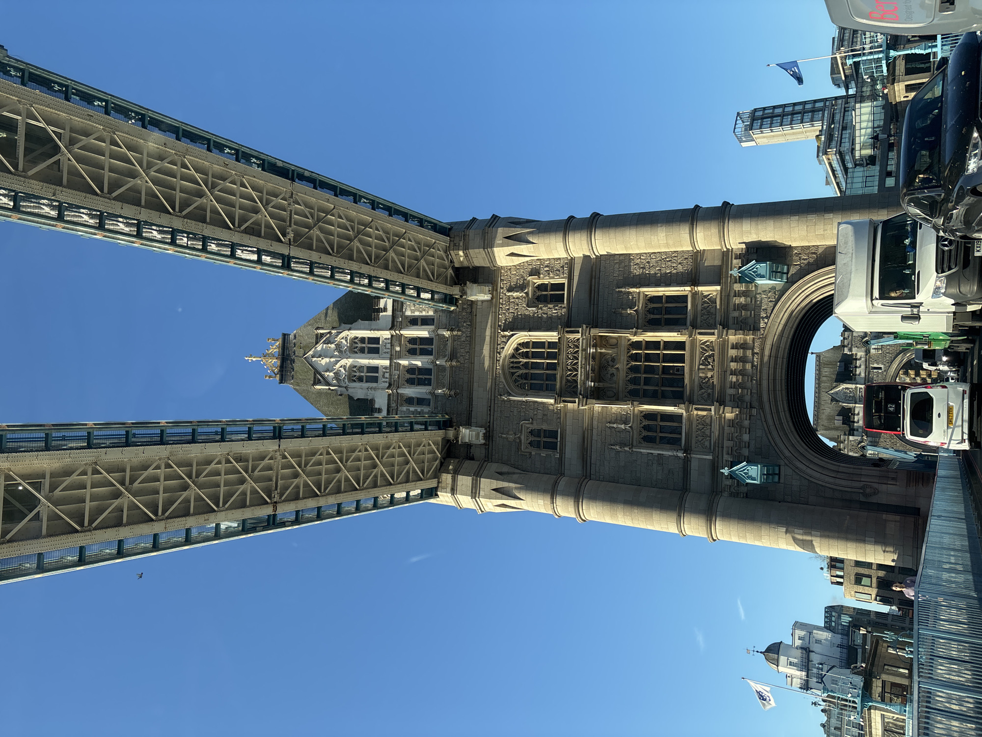 - "An upward-angled photograph captures the upper portion of the eastern tower of Tower Bridge in London, United Kingdom, against a clear, bright blue sky" by FM-gN3ec2, licensed under CC BY 4.0