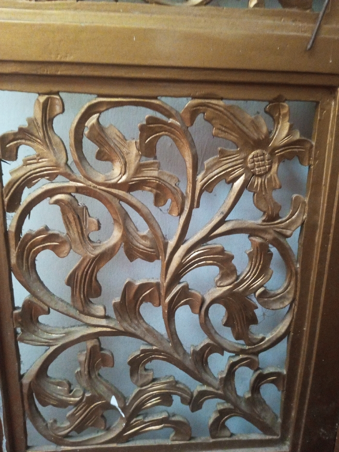 A close-up shot showcases a golden, ornate carved design. The carving features swirling vines, curling leaves, and a central floral motif with textured petals and center. The entire design is encased within a rectangular frame, also golden, with a plain surface. The background visible through the carving is a muted, light blue. The overall impression is one of vintage elegance and intricate craftsmanship.