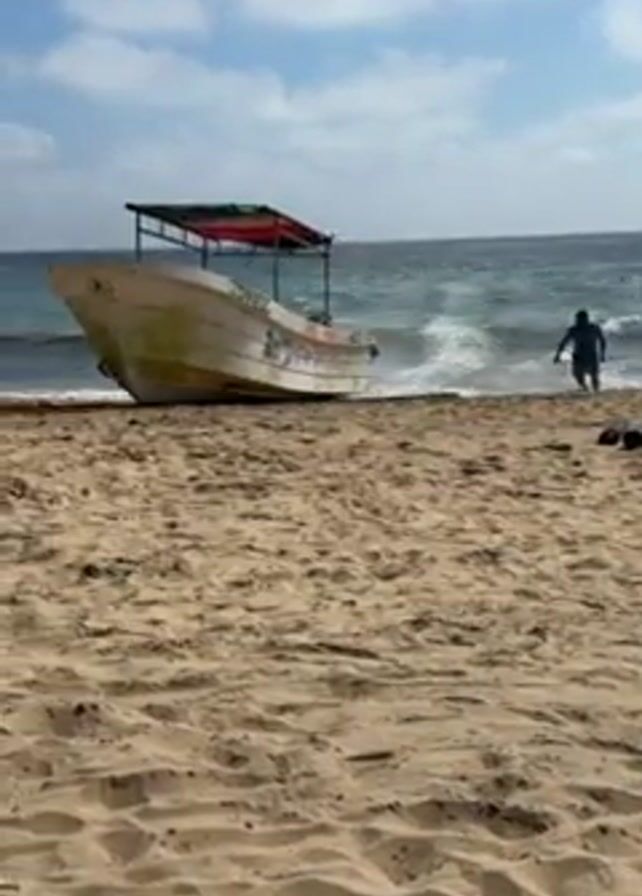 partially beached boat on a sandy beach. The boat is white with a red and green canopy and graffiti on its side. The waves are lapping around the boat. A man is standing in the water near the boat. The sky is blue with scattered clouds. The sand is a light tan color. There are some dark objects in the foreground to the right. The video appears to be taken from under an umbrella, partially visible in the upper left.