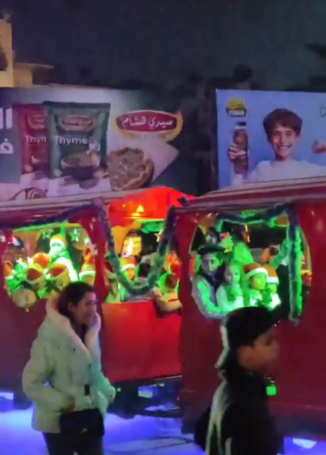 small, red, Christmas-themed train at night, decorated with green lights. Children wearing Santa hats are riding inside. People are walking by, including a person in a white jacket, a man in a tan puffer jacket, and others partially visible. In the background, there are billboard advertisements featuring food products and people. The scene appears to be a public space during a festive event. The focus is on the train and the people around it.