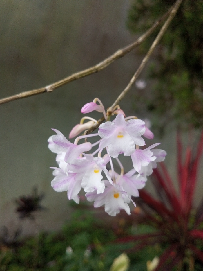 This close-up photograph, taken in Tecuci, Romania, presents a cluster of approximately ten to twelve small, pendulous flowers. The blooms are predominantly white with pale lavender to pink streaks on their petals and a distinct yellow central marking. Several flowers are fully open, displaying their yellow centers, while others appear as tight, light pink buds. They are suspended from a slender, brown, organic stem that traverses the upper portion of the frame. The primary subject is in sharp focus, contrasted by a heavily blurred background. This background includes a light gray, planar surface on the upper left, dense, dark green foliage on the upper right, and a plant with striking dark red, elongated leaves or stems occupying the lower right quadrant. Indistinct dark green plant material is also visible in the lower left.