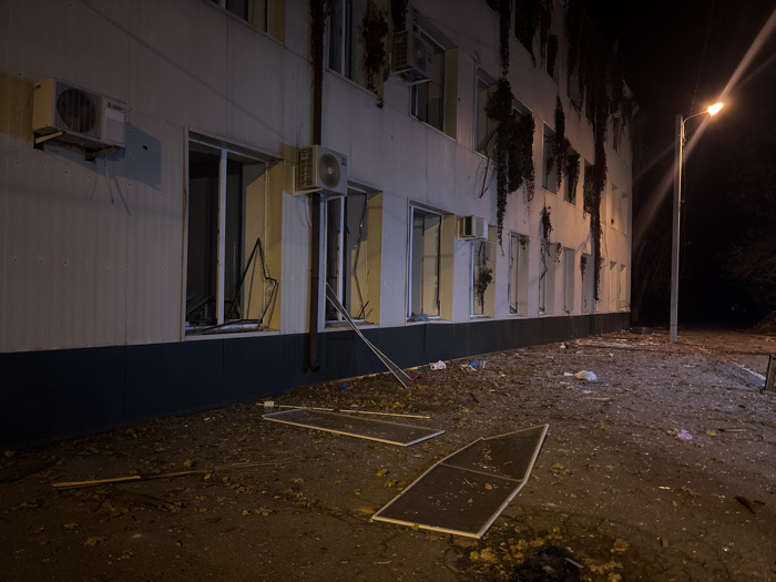 - "The image displays a nighttime scene in Kharkiv, Ukraine, centered on a damaged, multi-story building" by FM-2g8Zp2, licensed under CC BY 4.0