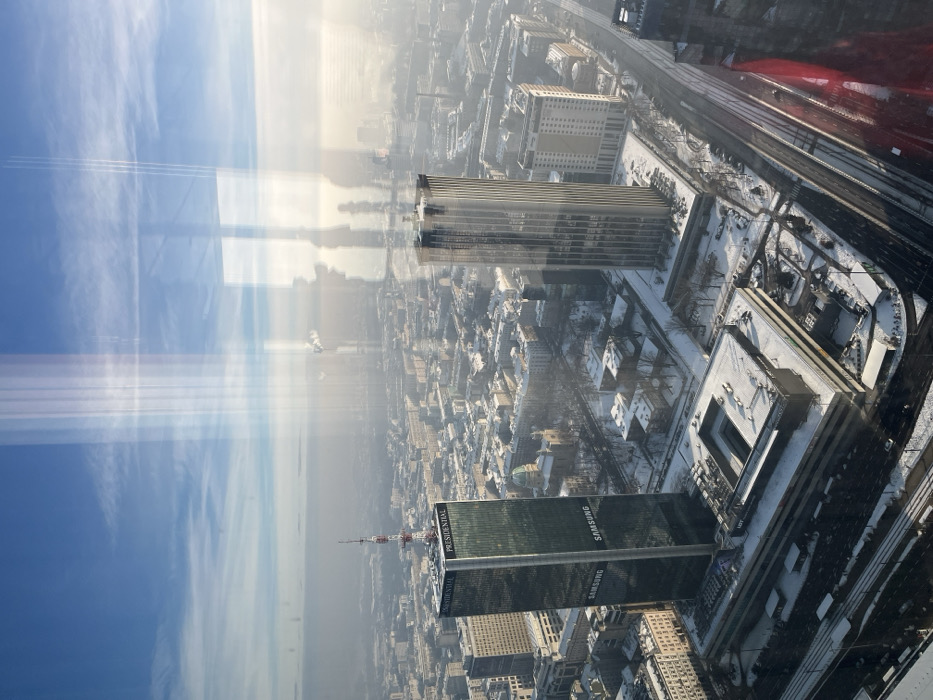 This image presents an elevated panoramic view of a snow-covered urban environment in Warsaw, Poland, specifically focusing on the central business district around Rondo ONZ. The vantage point is from a high-rise building, looking generally east or southeast. The scene is dominated by two prominent skyscrapers. To the left is the Presidential Tower (formerly Hotel InterContinental Warsaw), a dark-glassed building featuring "Presidential" and "Samsung" logos, topped with a communications mast. To its right stands the Rondo 1 building, a tall, slender skyscraper characterized by its lighter facade and vertical structural lines. Numerous other buildings of varying heights and architectural styles populate the surrounding landscape, many with snow accumulation on their rooftops. The ground is uniformly covered in a layer of white snow, visible on streets, plazas, and the roofs of lower structures, indicating a winter season. Bare trees are visible, dusted with snow. Roads are discernible, some showing clear asphalt from vehicle traffic, while railway tracks are visible in the lower-left quadrant. The sky transitions from a clear blue overhead to a distinct band of atmospheric haze or pollution at the horizon, obscuring distant landmarks. The lighting suggests a bright, possibly sunny day. The entire image is affected by significant reflections on the viewing window, including linear elements consistent with window frames and other internal structures, which are superimposed over the cityscape. A prominent, diffuse red reflection is present in the bottom-right corner of the frame. No individuals, specific actions, or interactions are discernible within the broad urban scene.