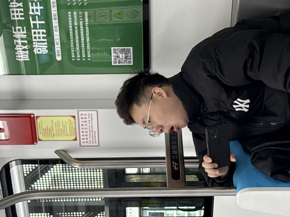 A man in a black jacket with a white logo is engrossed in his phone on public transport. He wears glasses with gold frames. Above him is a sign in Chinese about cabinetry. A red emergency pull box is visible on the left, along with a caution notice. The interior of the train is apparent, with handles and windows. The man appears focused on the screen.