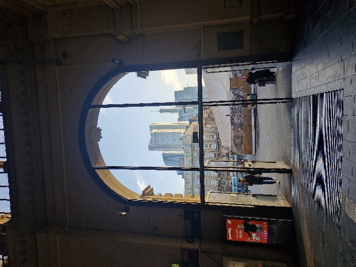 - "The image presents a forensic view from within the Frankfurt Hauptbahnhof in Frankfurt, Germany, looking outward through a grand, dark-framed arched glass doorway" by FM-WNeXD3, licensed under CC BY 4.0