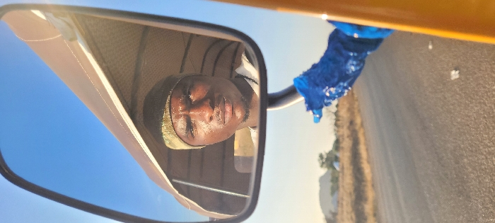 The image depicts a scene in Buga da Gindi, Nigeria, framed primarily by a vertical side-view mirror of a vehicle. The mirror reflects the upper body of a dark-skinned adult male, identified as the driver, wearing a green and brown camouflage-patterned beanie and a light-colored shirt with a dark beaded necklace. His face appears moist, consistent with perspiration. The reflected interior shows parts of a beige canvas vehicle canopy. To the right of the mirror, a segment of the vehicle's yellow exterior is visible. Below the mirror, a hand covered in crumpled, shiny blue material, possibly a glove or plastic bag, extends from the vehicle, angled towards the road. The background features an asphalt road with scattered white debris, bordered by dry, light-brown vegetation. In the distance, low hills are visible against a clear, bright blue sky.