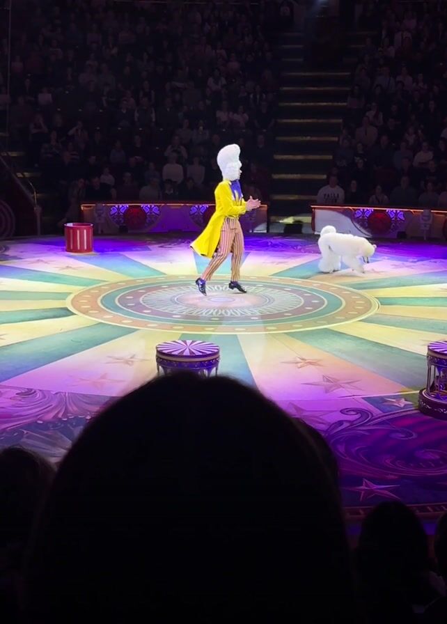 circus performance. A performer wearing a bright yellow and blue striped suit with a large white headpiece is in the center of the ring. The ring has a patterned floor of concentric circles with stars on a purple and pink background surrounding the circle. Several people sit in the rows of seats surrounding the ring. The performer gestures to a fluffy white dog, possibly a poodle, which jumps up and performs tricks on small platforms. The performer runs around the ring and throws a white cloth up into the air, before catching it again.