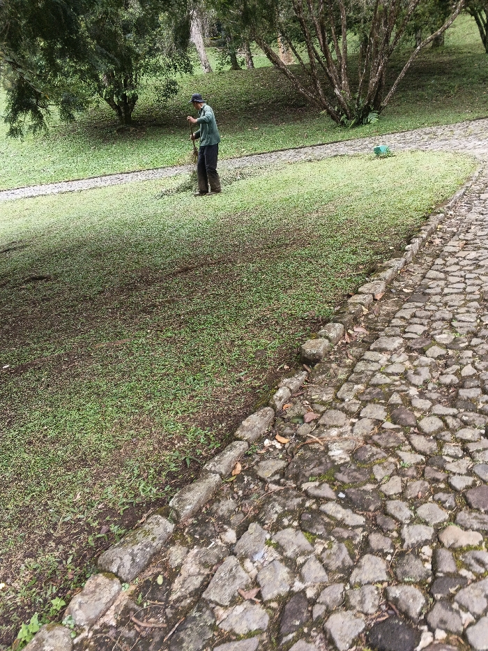 The scene depicts an outdoor landscaped area in Kadoma, Zimbabwe. One adult male is present, positioned on a grassy slope. He wears a dark bucket hat, a long-sleeved green shirt, dark trousers, and dark boots. The individual is actively engaged in grounds maintenance, using a long-handled tool resembling a rake or broom to clear the grass. To the man's right and further up the slope, a small, light green object, possibly a watering can or container, is visible on the grass. The lower right portion of the image features a winding path constructed from irregular, greyish-brown cobblestones, which is bordered by a raised stone edge separating it from the grassy slope. The grass itself is predominantly green with darker, possibly disturbed or matted areas. In the background and surrounding the main area, numerous trees with green foliage and visible trunks suggest a park or garden environment. The lighting is diffused, indicative of an overcast sky or shaded conditions.