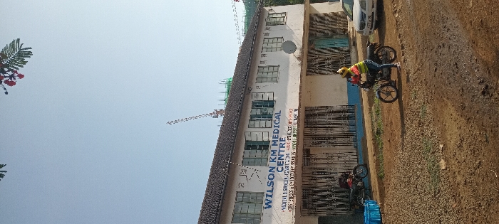 A light-colored, two-story building with the words "WILSON KM MEDICAL CENTRE" visible on the side. There are many windows on the building. Construction crane is visible in the distance, indicating construction or renovation work. A man wearing a safety vest sits on a motorcycle near the building and car parked nearby. The ground is dirt, suggesting a roadside location.