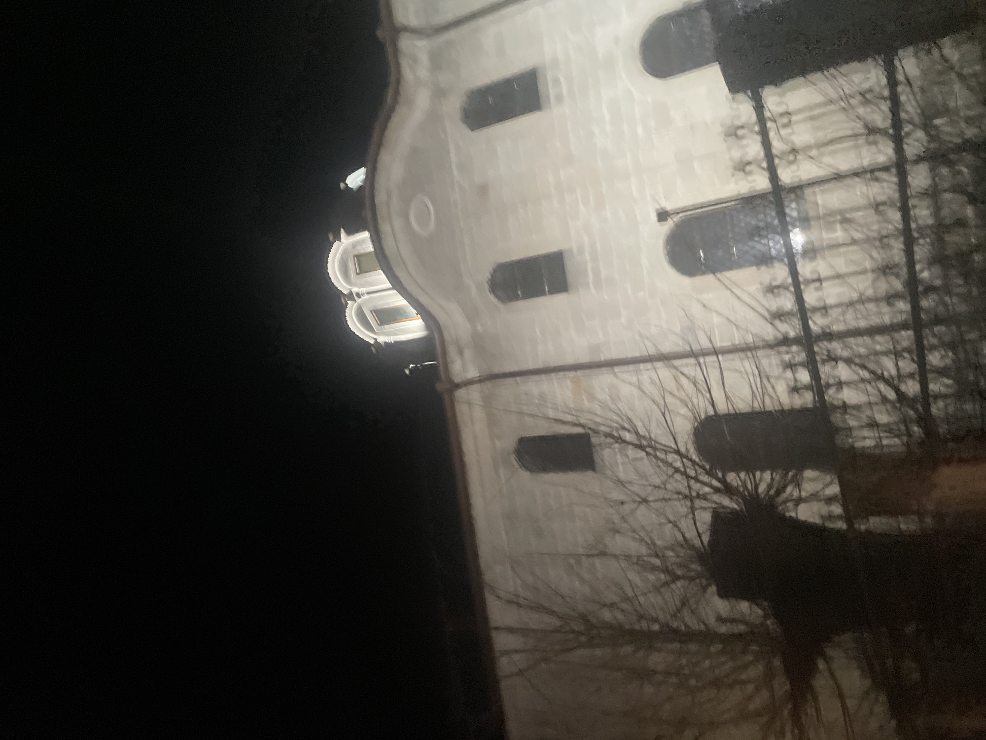 The image captures an illuminated stone or stucco building at night, identified as a church in Elena, Bulgaria. The building features light-colored walls with multiple arched windows, some revealing dark interiors while others reflect light. A prominent, ornate roofline presents a central section with two smaller, illuminated cupolas or domes. A small, light-colored object, possibly a statue, is positioned on the roof to the upper right of these domes. In the foreground, a dark, wrought-iron fence with decorative elements partially obscures the lower section of the building. Bare tree branches are silhouetted against the brightly lit facade, intertwining with the fence. A dark fence post is visible on the far right. The background is a dark, starless night sky. No individuals or active subjects are present.