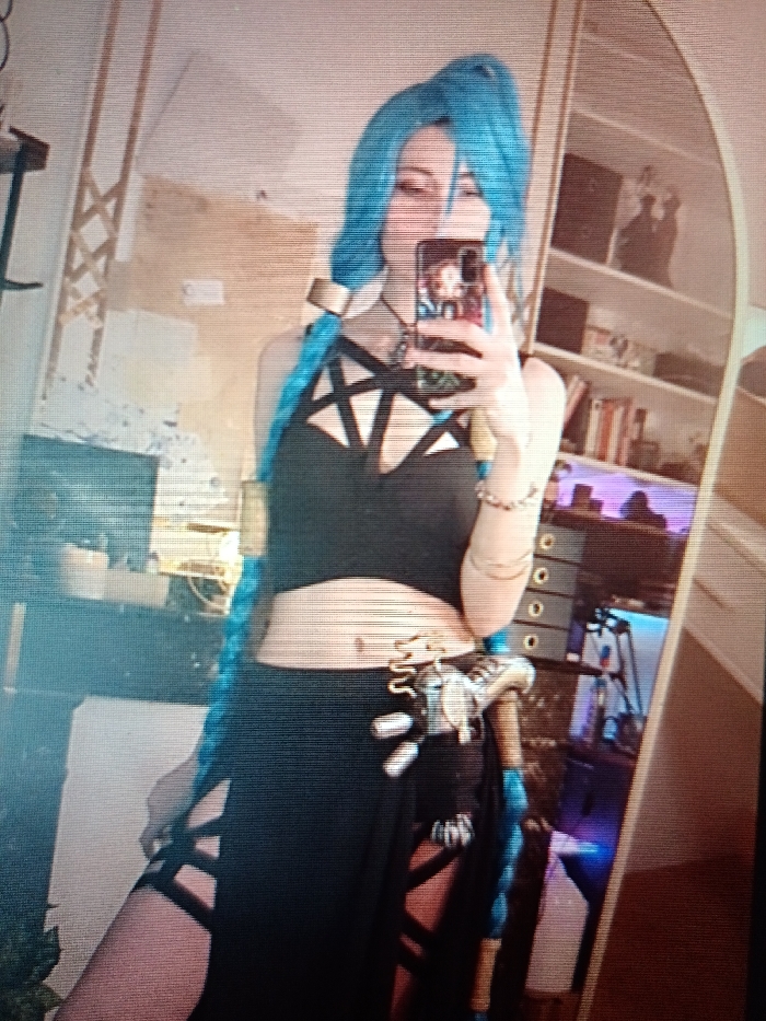 A female individual is depicted taking a mirror selfie in an indoor setting in Toulouse, France. She has long, braided, bright blue hair styled in a high ponytail, with two braids extending over her shoulders, accented by gold-colored bands. Her attire consists of a black crop top with geometric chest cutouts, exposing the midriff. She wears a wide, light-colored waist belt and a long black skirt with multiple upper-thigh cutouts. Accessories include a necklace with a dark pendant, multiple bracelets and armbands on her right forearm, and a multi-component metallic (silver and gold-toned) accessory resembling a mechanical hand, along with a separate gold-toned wavy ornament, affixed to the right side of her belt. She holds a dark-colored smartphone in her right hand, partially obscuring her face, with the phone case displaying multiple cartoon characters. The background, reflected in the mirror, reveals a room featuring a distressed wall finish on the left, alongside a light-colored object and visible green foliage. To the right, a white shelving unit holds books and dark storage containers, illuminated by a purple-blue light source emanating from beneath a shelf. A stack of drawers and a tripod are also present within the reflection.