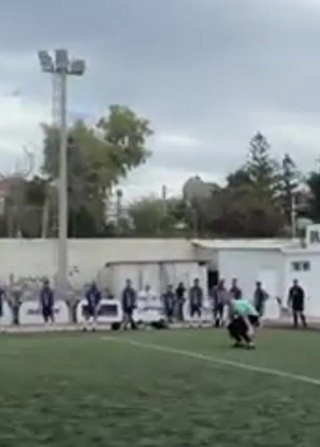 A soccer match is in progress on a green turf field under a cloudy sky. A man in a gold and black jersey is kicking the soccer ball toward the goal. A man in a green jersey is diving to block the kick. Standing in the goal is a man in a black jersey, apparently acting as goalie. Behind the field are a number of white tents. A line of men in purple jerseys is standing behind the player kicking the soccer ball. A small building with the words "REA Women F.C." written on the side is situated behind the goal, along with a man in an orange jersey who appears to be a referee.