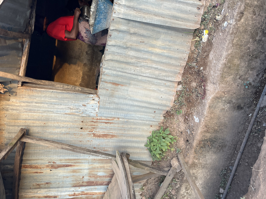 A dilapidated structure with corrugated metal walls and wooden supports is visible. A person wearing a red shirt can be seen through an opening, seemingly looking inside. The ground outside the structure is dirt and concrete, with some vegetation growing near the metal wall. The angle suggests the photo was taken from above.